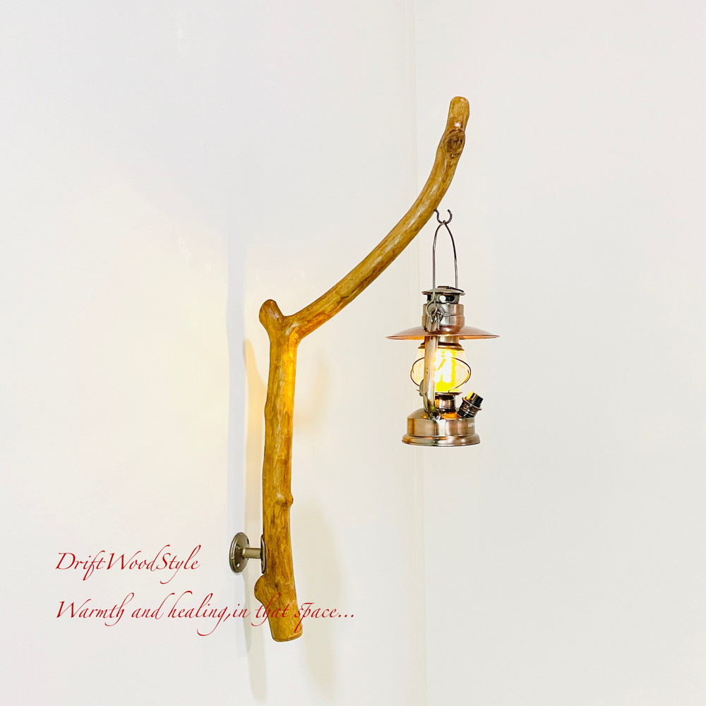 ランプや小物を飾れる天然流木の壁掛け流木スタンドです。
