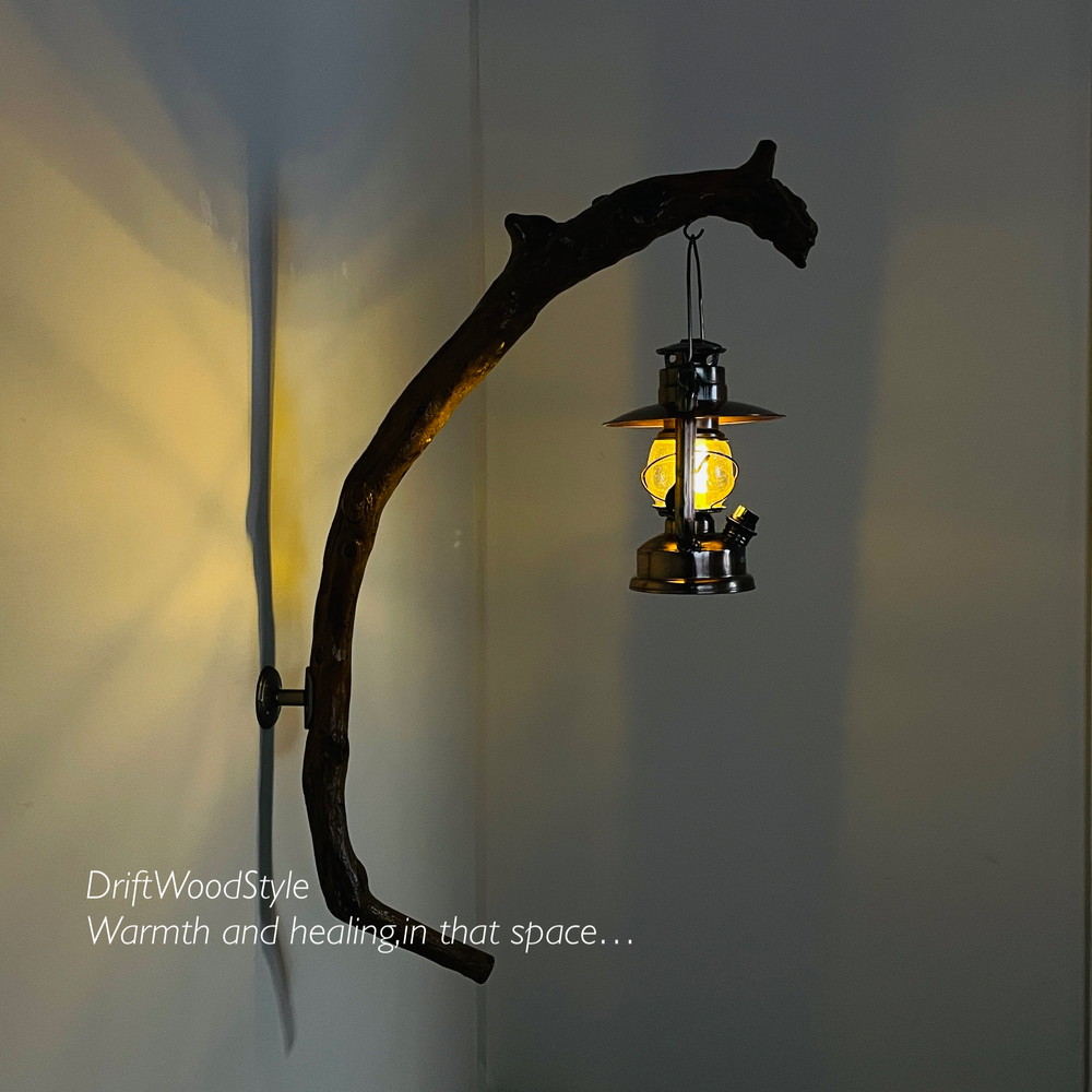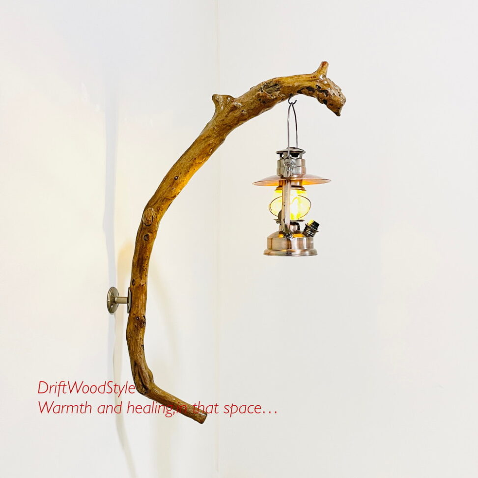 ランプや小物を飾れる天然流木の壁掛け流木スタンドです。