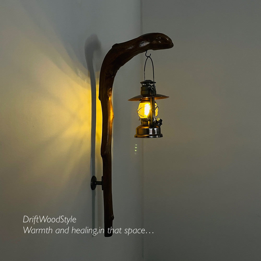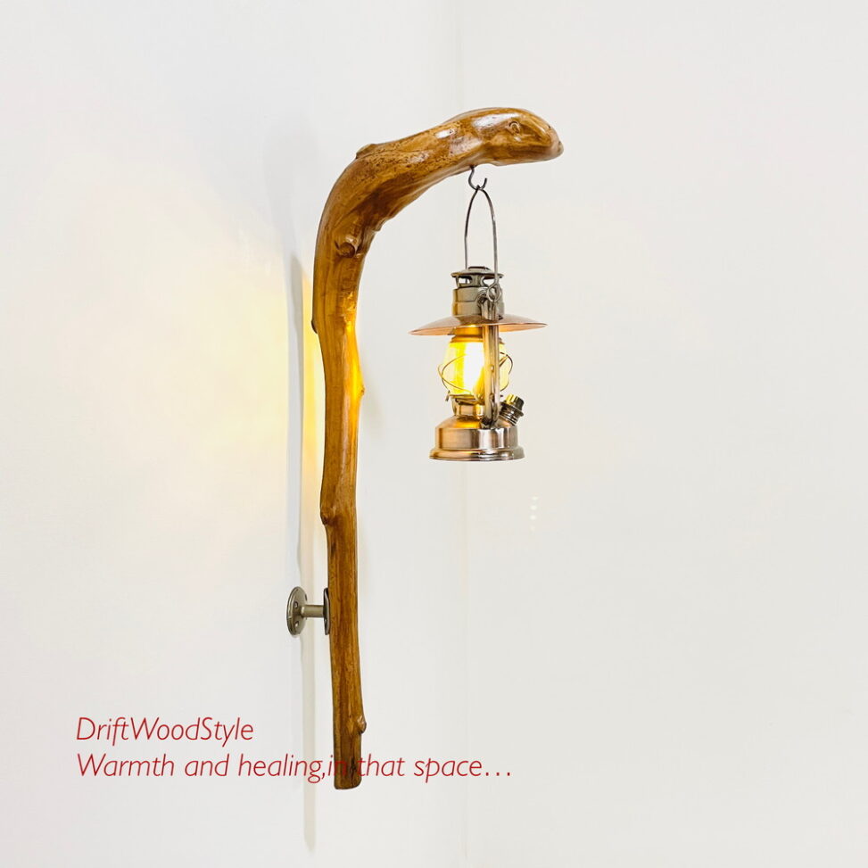 ランプや小物を飾れる天然流木の壁掛け流木スタンドです。