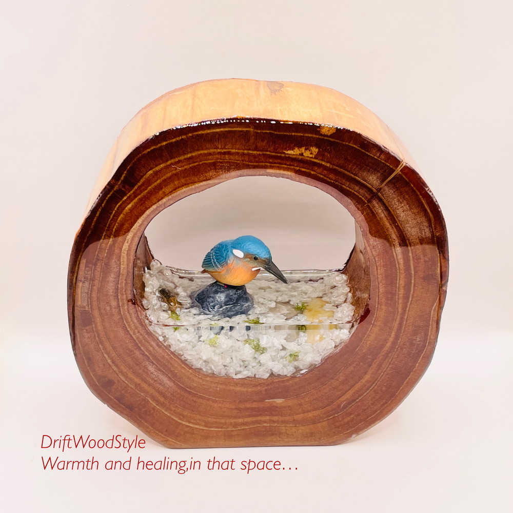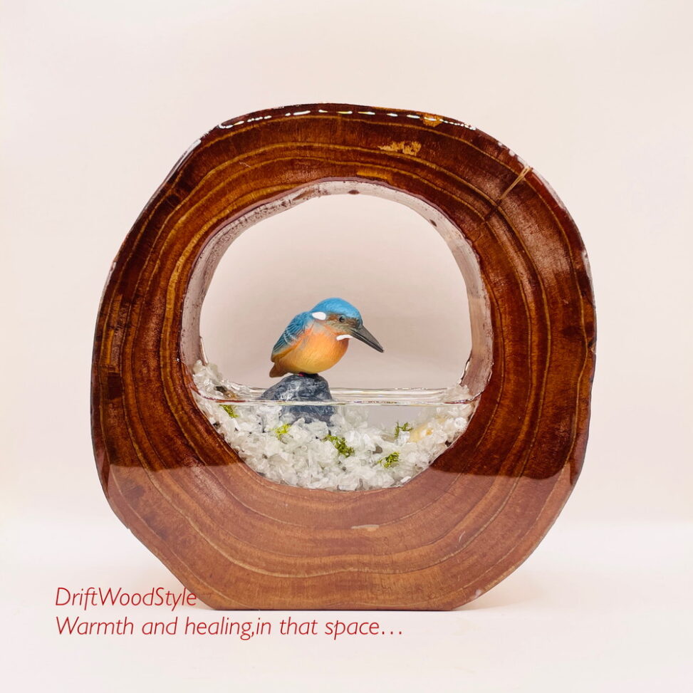 流木と自然界を結び付けて表現するために作成した,レジンアートです。