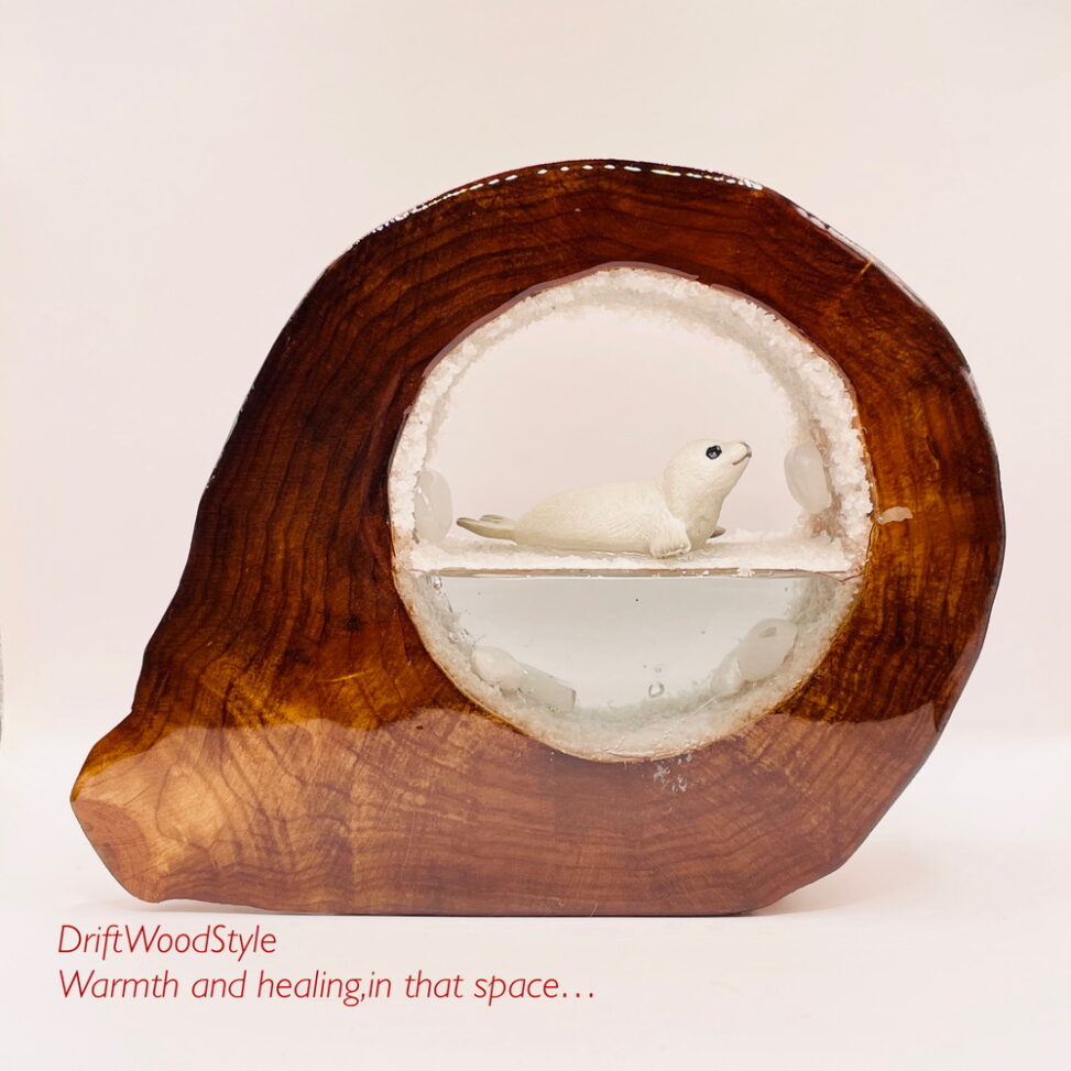 流木と自然界を結び付けて表現するために作成した,レジンアートです。