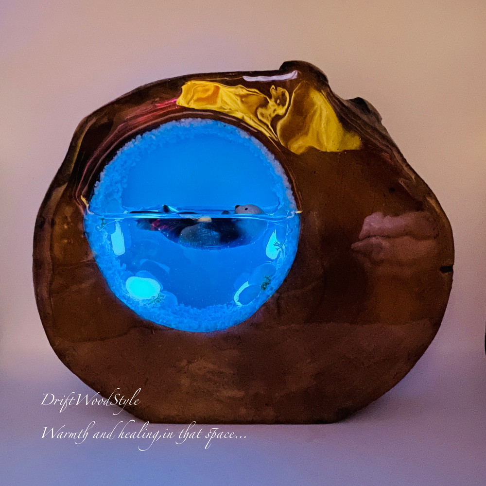流木と自然界を結び付けて表現するために作成した,レジンアートです。