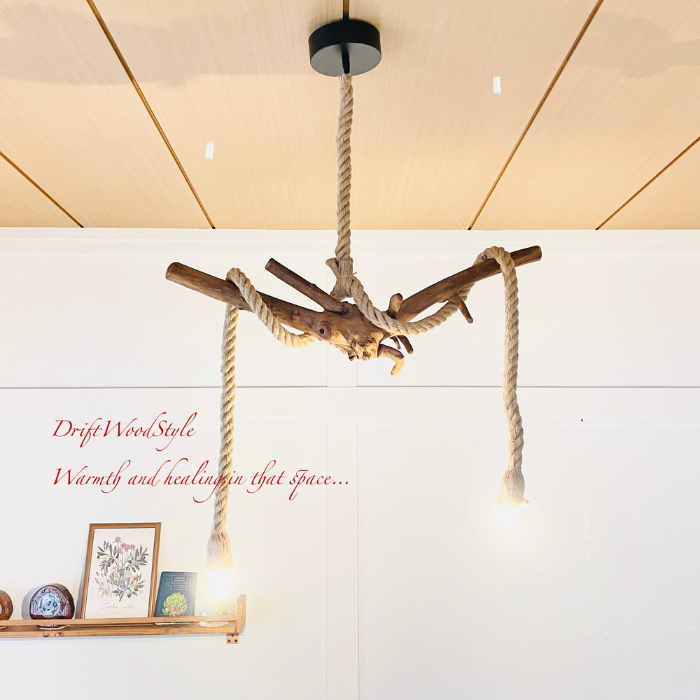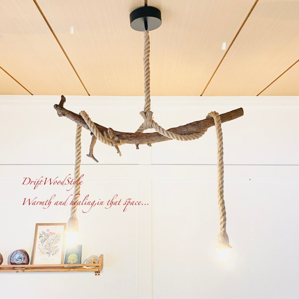 麻ロープの照明器具を流木に自由に絡ませて飾ることができます。
