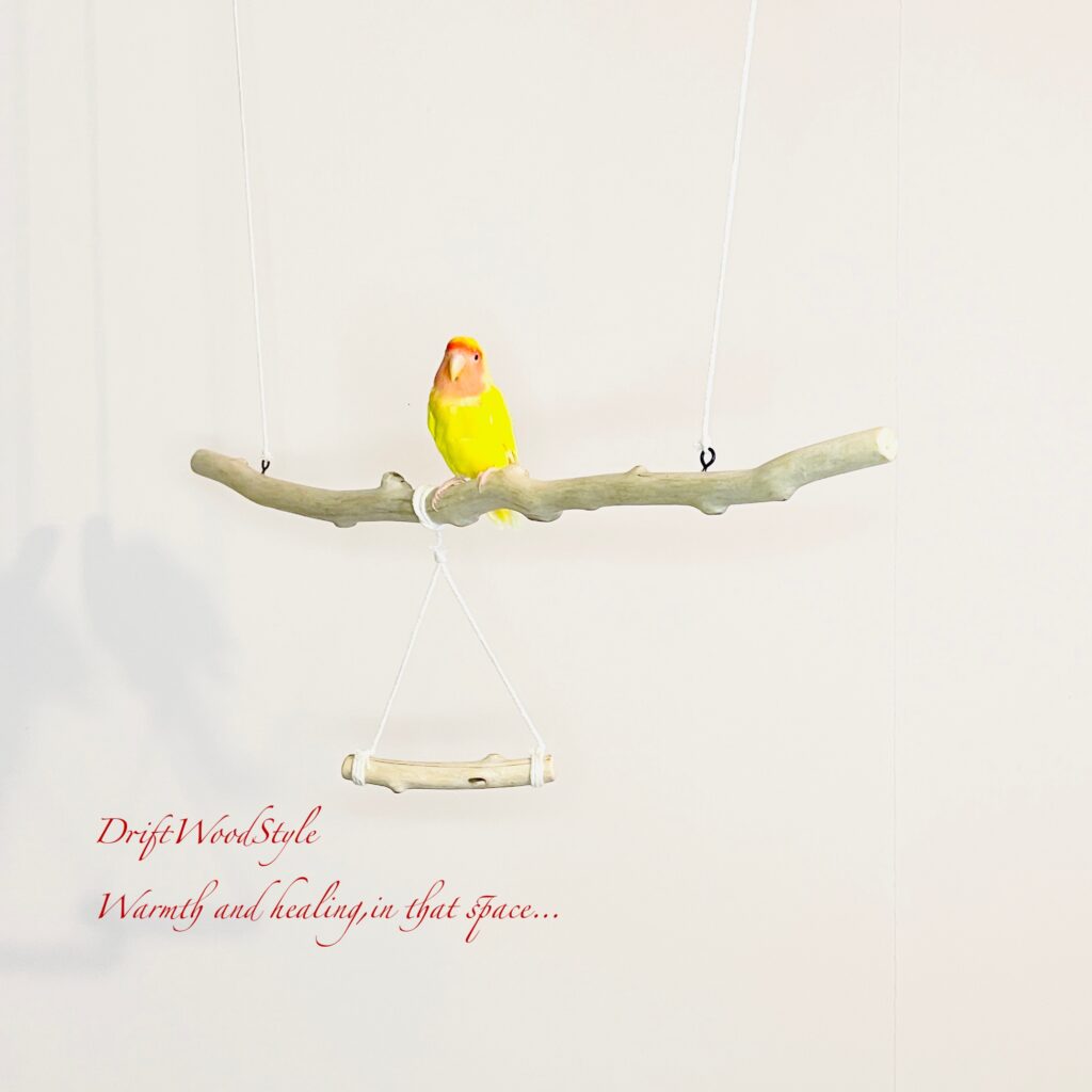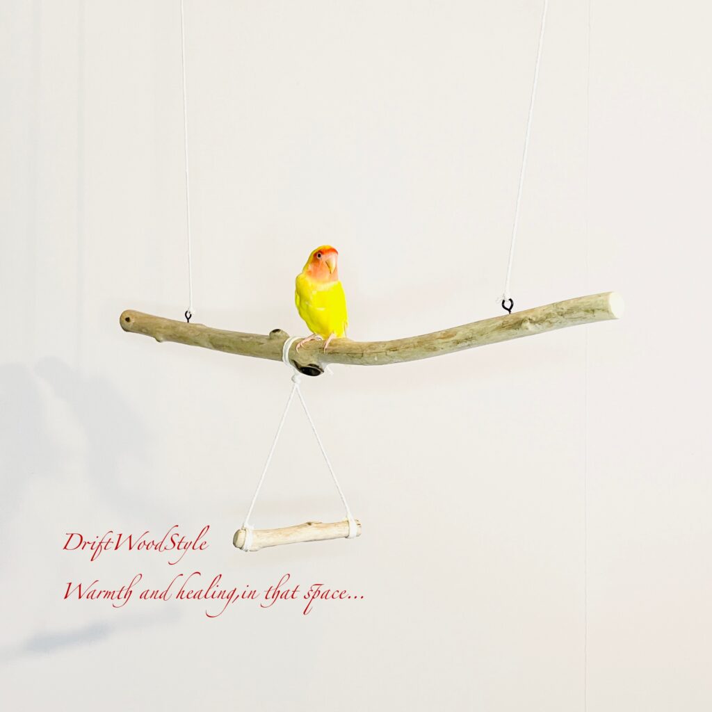 長い流木枝で小鳥が遊べる吊り下げタイプの止まり木です。