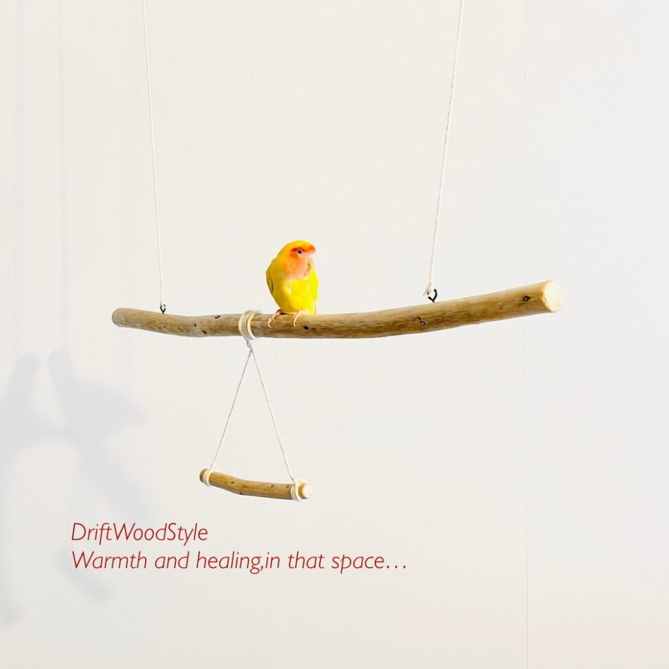 長い流木枝で小鳥が遊べる吊り下げタイプの止まり木です。