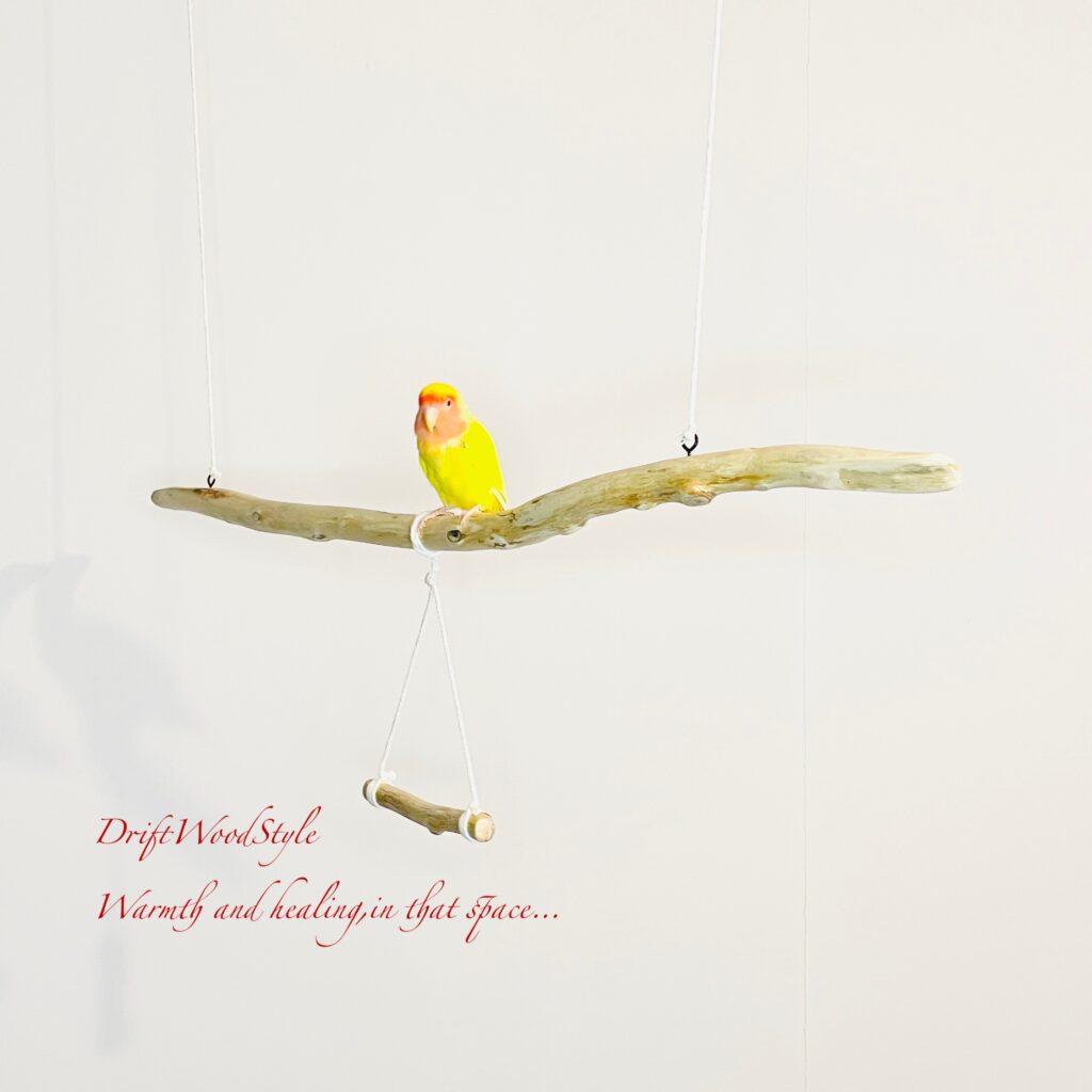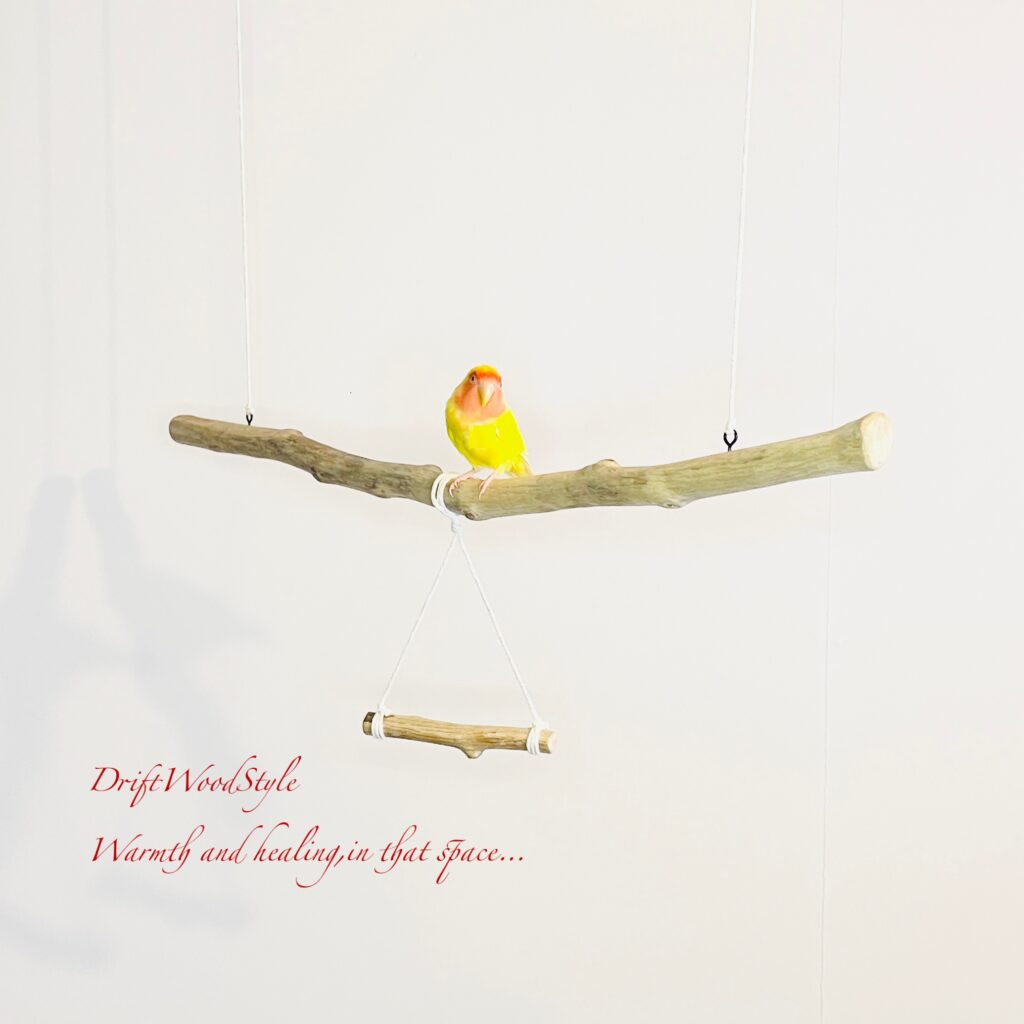 長い流木枝で小鳥が遊べる吊り下げタイプの止まり木です。
